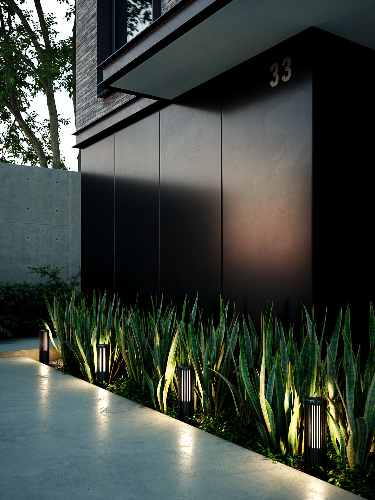 Skulpturales Design und moderner Minimalismus –. Eine kompakte und vielseitige Deckenleuchte, die einen schönen Licht- und Schatteneffekt sowie ein einladendes Ambiente in Ihrem Außenbereich schafft.