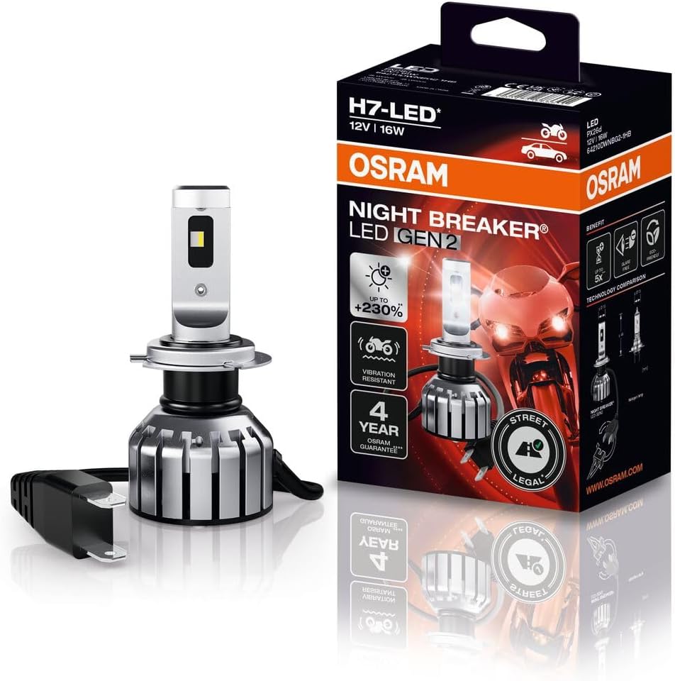 Die NIGHT BREAKER H7-LED GEN 2 von OSRAM ist die erste straßenzugelassene LED-Nachrüstlampe für Motorräder, die Abblend- und Fernlicht auf moderne LED-Technologie umstellt. Sie bietet bis zu 230 % mehr Helligkeit bei tageslichtähnlicher 6000 K-Farbtemperatur, ist vibrationsresistent, bis zu fünfmal langlebiger als herkömmliche H7-Lampen und reduziert Blendung um bis zu 50 %.